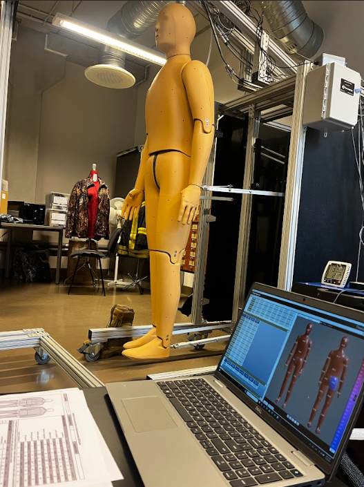 The third room has a single machine, “Andie,” a unique device that consists of a mannequin with many sensors, a mechanism that moves it, and a climate chamber. However, the laboratory does not have a climate chamber yet and is seeking financing to purchase one in the future. There are only 13 such machines in the world, and the complex without the chamber costs around 500000 dollars. Andie can imitate the movement and sweating of a real person and is connected to a nearby PC to collect data. The other similar machine is located at Dresden University. They also use small red figurines to keep the door open.