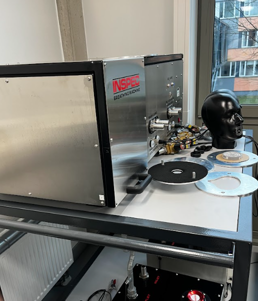 The first room requires special climate conditions, as the materials tested are sensitive to humidity and temperature. It is equipped with a range of devices, such as a washing machine, oven, pH tester, water resistance tester, tensile strength tester, and many others. It also houses a special device called the Sheffield head—which resembles a black head—that imitates breathing for testing respiratory equipment. In the center of this room, there is an isolated area for biological testing; this space is kept sterile, and people are allowed in only with permission.